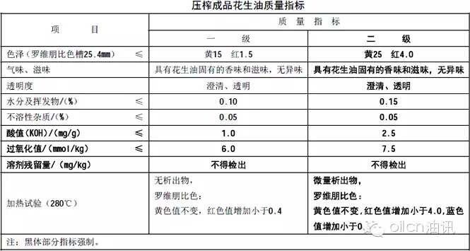 花生油的國家標(biāo)準(zhǔn)GB/T1534-2003將花生油分為花生原油和壓榨成品花生油、浸出成品花生油三類。壓榨花生油又分為壓榨一級和壓榨二級,浸出花生油劃分為浸出一級至四級。