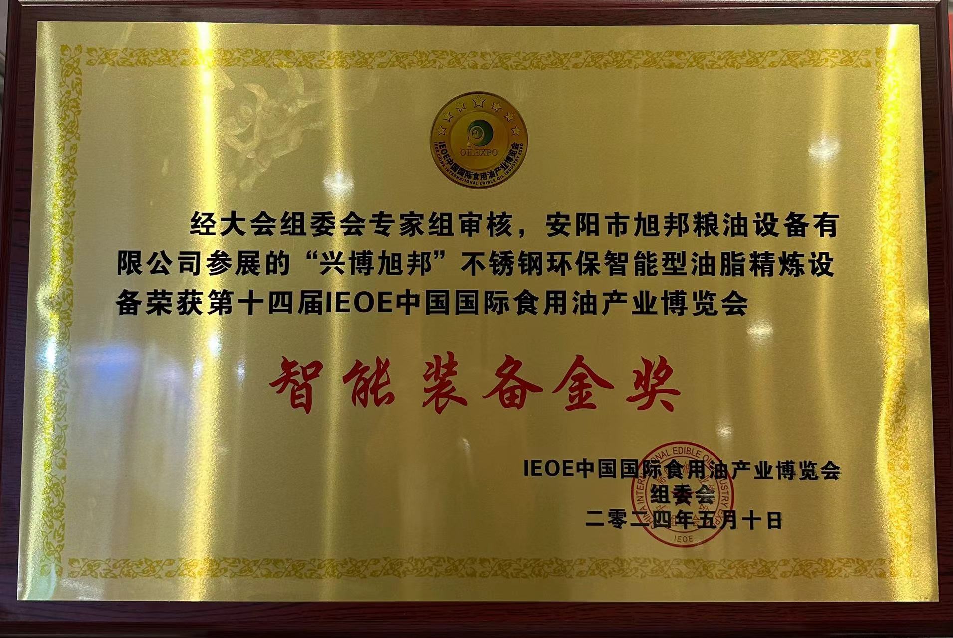 5月10日,第十四屆IEOE中國國際食用油產(chǎn)業(yè)博覽會在南京國際展覽中心啟幕。我公司參展的不銹鋼環(huán)保智能型油脂精煉設(shè)備經(jīng)大會組委會專家組審核,榮獲智能裝備金獎。